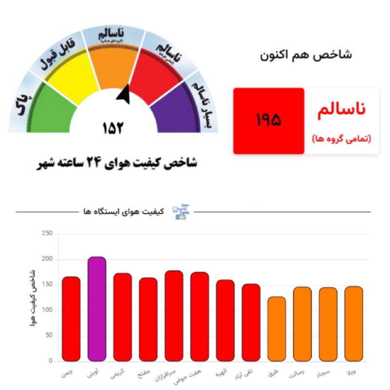 🔹هماکنون، شاخص لحظهای هوای مشهد با عدد ۱۹۵ در وضعیت ناسالم برای تمام گروهها قرار دارد.