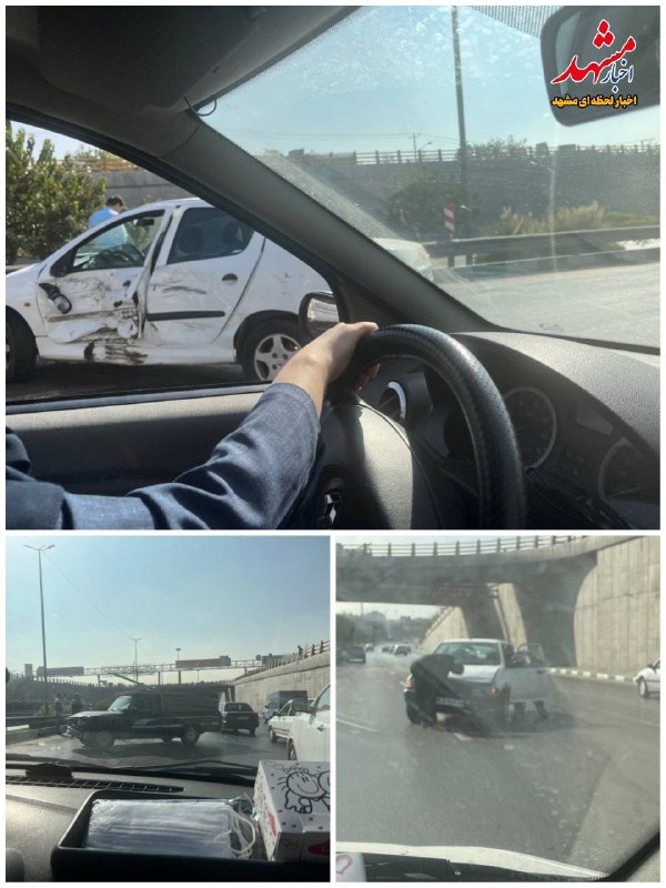 ⭕️ مخاطب اخبار مشهد با ارسال این تصویر نوشت ؛ مسیر بزرگراه به دلیل سانحه به شدت چرب و لغزنده شده بود و چند خودرو دچار عدم تعادل شدند و موتورسیکلت ها زمین می خوردند.