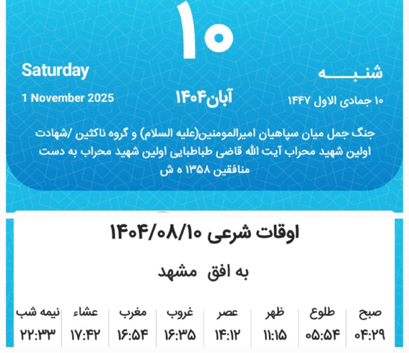 📷اوقات شرعی شنبه دهم آبان ماه ۱۴۰۴ به افق مشهد (احتیاط یک تا دو دقیقهای لحاظ شود)