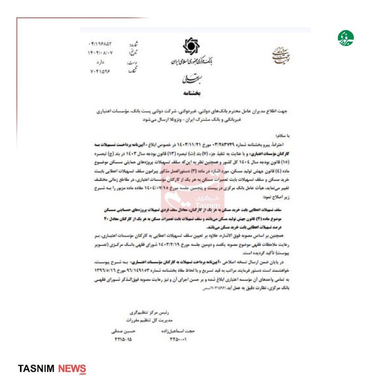 🔸بانک مرکزی: سقف وام کارکنان بانکها معادل تسهیلات جهش مسکن شد