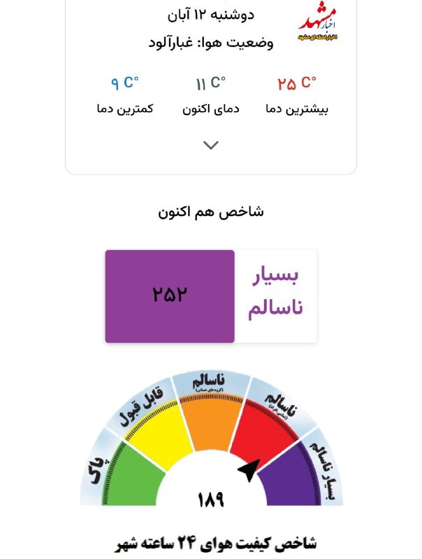 💢هم اکنون شاخص کیفی هوای مشهد با عدد ۲۵۲ در وضعیت بسیار ناسالم قرار دارد.