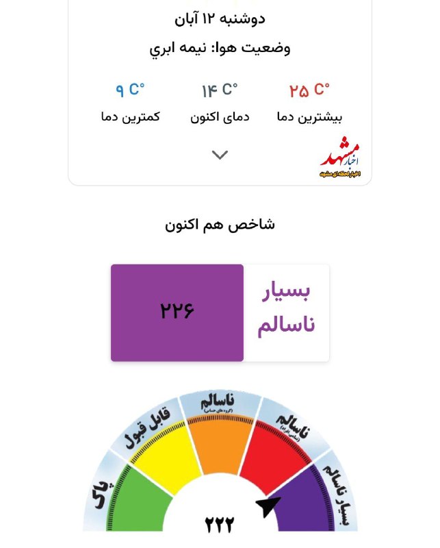 💢هم اکنون شاخص کیفی لحظه ای و ۲۴ ساعته هوای مشهد بالاتر از ۲۰۰ و در وضعیت بسیار ناسالم قرار دارد و نفس کشیدن در هوای مشهد برای همه افراد آسیب را است.