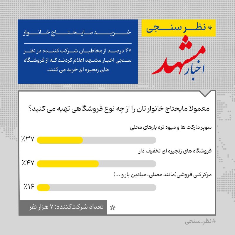 🔸۴۷ درصد از مخاطبان شرکت کننده در نظر سنجی اخبار مشهد اعلام کردند که از فروشگاه های زنجیره ای خرید می کنند.