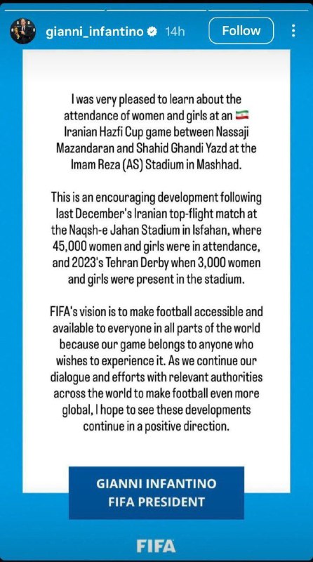 📷حضور زنان در ورزشگاه مشهد دلگرمکننده است/ استوری اینفانتینو در واکنش به حضور زنان در ورزشگاه امام رضا(ع)