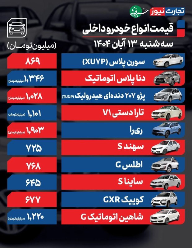 🔸قیمت خودرو امروز ۱۳ آبان ۱۴۰۴ / فرمان بازار Posted on نوامبر 4, 2025 🔸قیمت خودرو امروز ۱۳ آبان ۱۴۰۴ / فرمان بازار خودرو به سوی کاهش قیمت چرخید@AkhbarMashhad
