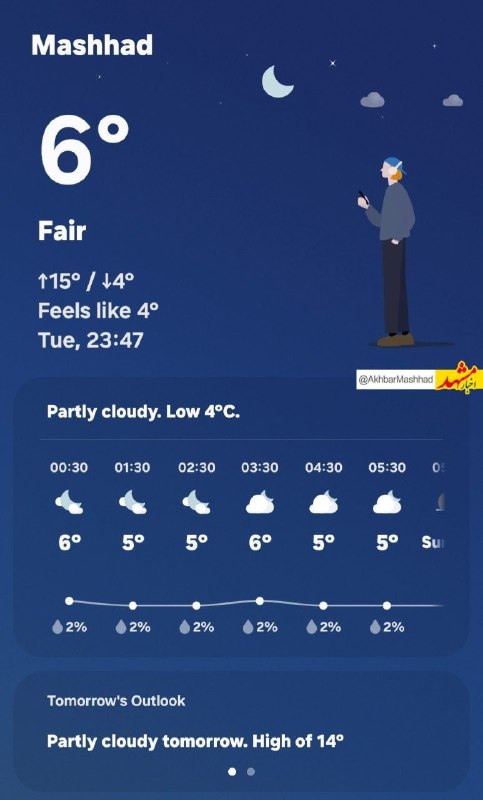 🔹هم اکنون دمای هوای شهر مشهد ۶ درجه می باشد و در ساعات ابتدایی بامداد فردا تا سپیده صبح همچنان  دما یک درجه دیگر کاهش می یابد