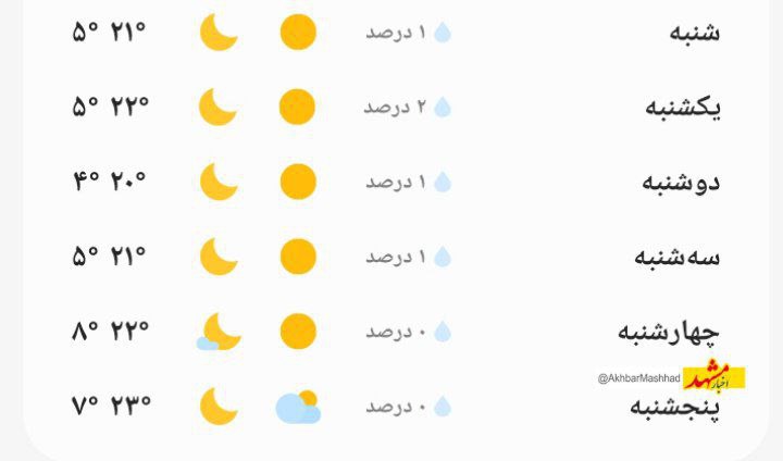 🔹از فردا شنبه تا روز پنجشنبه هفته آینده حداکثر دمای هوای مشهد بین ۲۱ تا ۲۳ درجه سانتیگراد متغیر است که در مقایسه با روزهای گذشته، اندکی افزایش خواهد داشت. این درحالی است که حداقل دما طی این روزها بین ۴ تا ۸ درجه سانتیگراد متغیر خواهد بود.