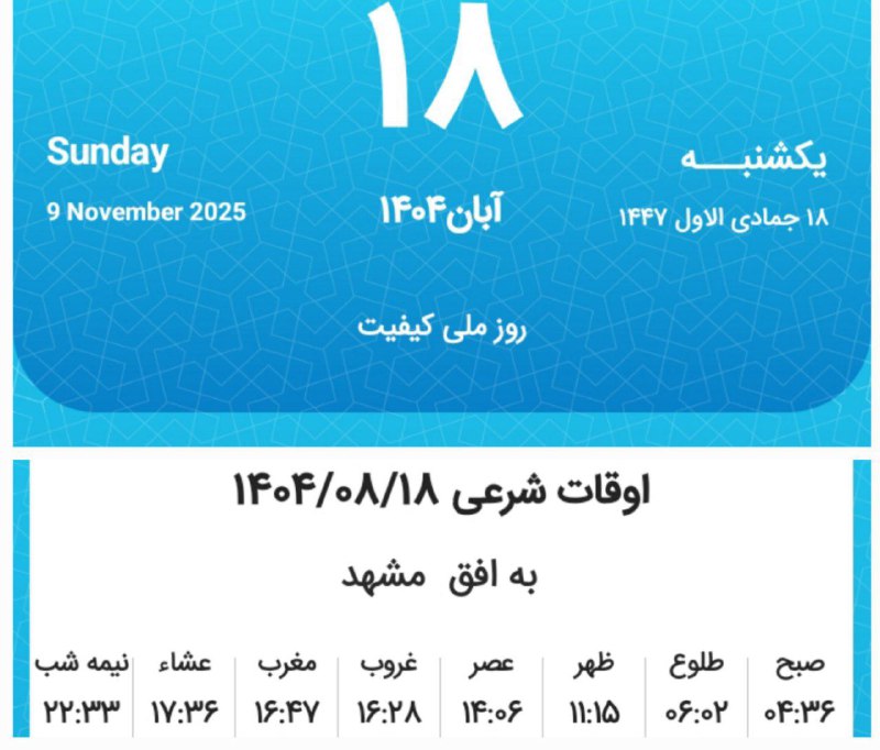 📷اوقات شرعی یکشنبه هجدهم آبان ماه ۱۴۰۴ به افق مشهد (احتیاط یک تا دو دقیقهای لحاظ شود)