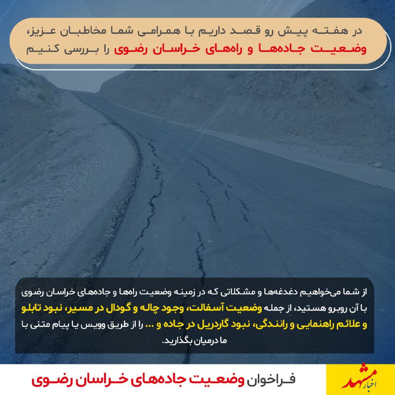🆔از شما می‌خواهیم دغدغه‌ها و مشکلاتی که در زمینه وضعیت راه‌ها و جاده‌های خراسان رضوی با آن روبرو هستید، از جمله وضعیت آسفالت، وجود چاله و گودال در مسیر، نبود تابلو و علائم راهنمایی و رانندگی، نبود گاردریل در جاده و … را از طریق وویس یا پیام متنی با ما درمیان بگذارید.