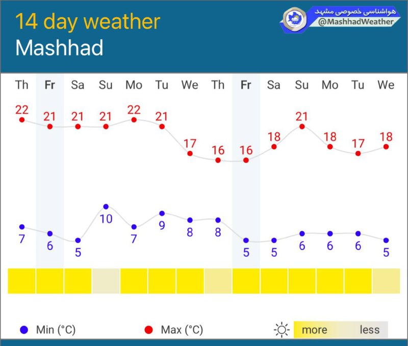• 🌏هوای مشهد؛ پنجشنبه ۲۲ آبان:🌤️صاف تا کمی ابری🔴حداکثر دما: