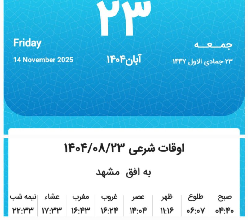 📷اوقات شرعی جمعه بیست سوم آبان ماه ۱۴۰۴ به افق مشهد (احتیاط یک تا دو دقیقه‌ای لحاظ شود)