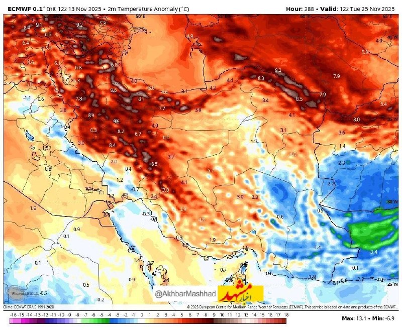 🔹پیشبینی معتبر ECMWF برای ۴ آذر ۱۴۰۴ (۱۱ روز دیگر):مشهد و خراسان رضوی با ناهنجاری +۱۰ تا +۱۳ درجه بالاتر از نرمال، یکی از شدیدترین گرماهای پاییزی سالهای اخیر را تجربه خواهند کرد.