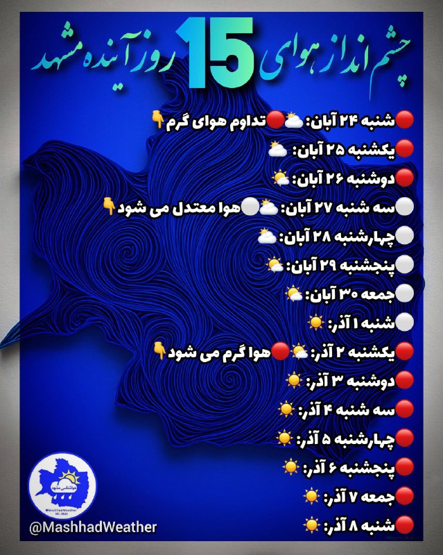 👁️ چشم انداز هوای ۱۵ روز آینده مشهد🍁هواشناسی خصوصی Posted on نوامبر 15, 2025 👁️ چشم انداز هوای ۱۵ روز آینده مشهد 🍁هواشناسی خصوصی مشهد👇 @MashhadWeather