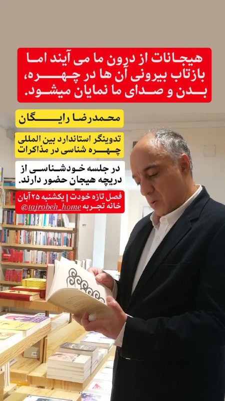 🔹 محمدرضا رایگان؛ تدوینگر استاندارد بین المللی چهره شناسی در مذاکرات در جلسه خودشناسی از دریچه هیجان حضور دارند.