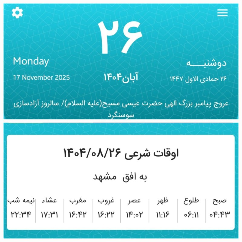 📷اوقات شرعی دوشنبه بیست و ششم آبان ماه ۱۴۰۴ به افق مشهد (احتیاط یک تا دو دقیقهای لحاظ شود)