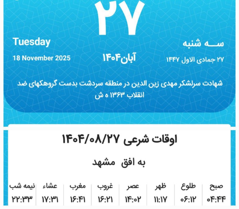 📷اوقات شرعی سهشنبه بیست و هفتم آبان ماه ۱۴۰۴ به افق مشهد (احتیاط یک تا دو دقیقهای لحاظ شود)