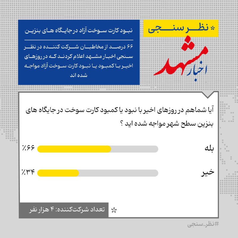 🔹۶۶ درصد از مخاطبان شرکت کننده در نظر سنجی اخبار مشهد اعلام کردند که در روزهای اخیر با کمبود یا نبود کارت سوخت آزاد مواجه شده اند.