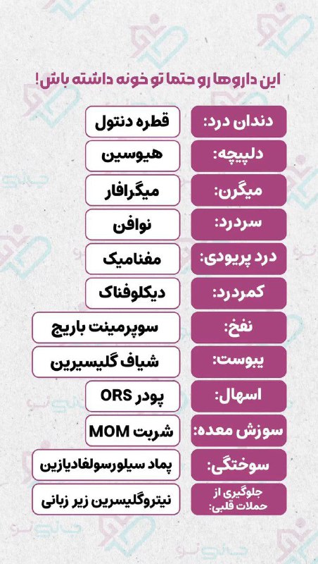 🔹لیست دقیق داروهای ضروری بستگی به شرایط خاص افراد و موقعیت دارد. این لیستها به عنوان راهنمایی کلی هستند و همواره باید با یک متخصص مشورت شود.