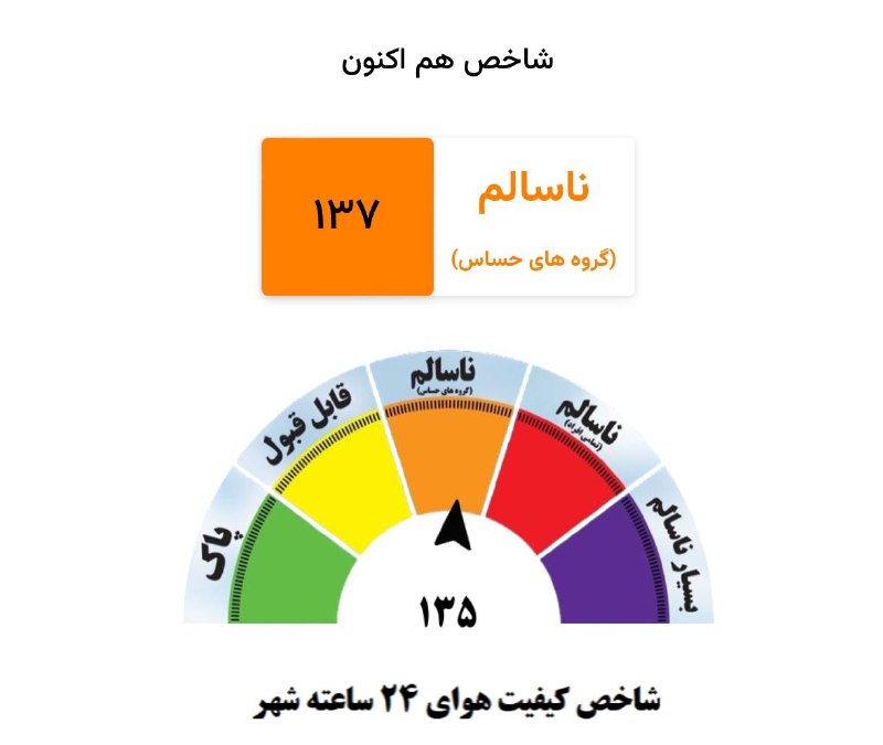 🔴کیفیت هوای هم اکنون مشهد با شاخص عددی 137 در وضعیت ناسالم برای افراد حساس قرار دارد.
