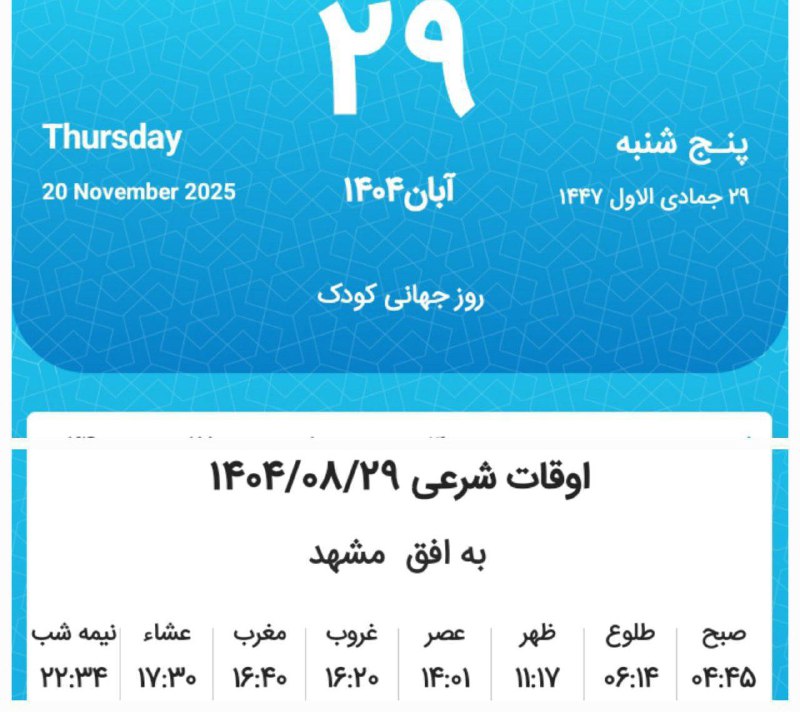 • 📷اوقات شرعی پنج‌شنبه بیست و نهم آبان ماه ۱۴۰۴