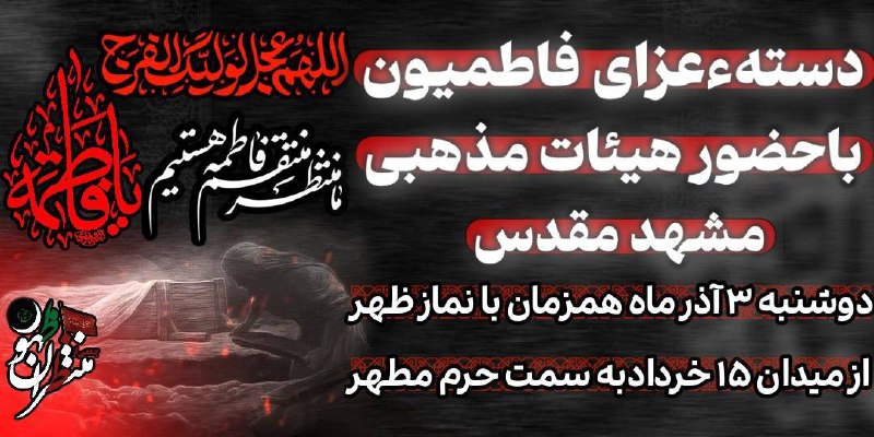 اَللّٰهُمَ عَجِّل لِوَليِّكَ الفَرَج مامنتظر منتقم فاطمه هستيمدسته عزاء Posted on نوامبر 21, 2025 اَللّٰهُمَ عَجِّل لِوَليِّكَ الفَرَج مامنتظر منتقم فاطمه هستيم دسته عزاء فاطميونبا حضور هيئات مذهبى مشهدمقدس دوشنبه ٣ آذر همزمان با نمازظهراز ميدان ۱۵خرداد(ضد)به سمت حرم مطهر رضوى جمعى ازمنتظران ظهورشماره تماس : 09155113651
