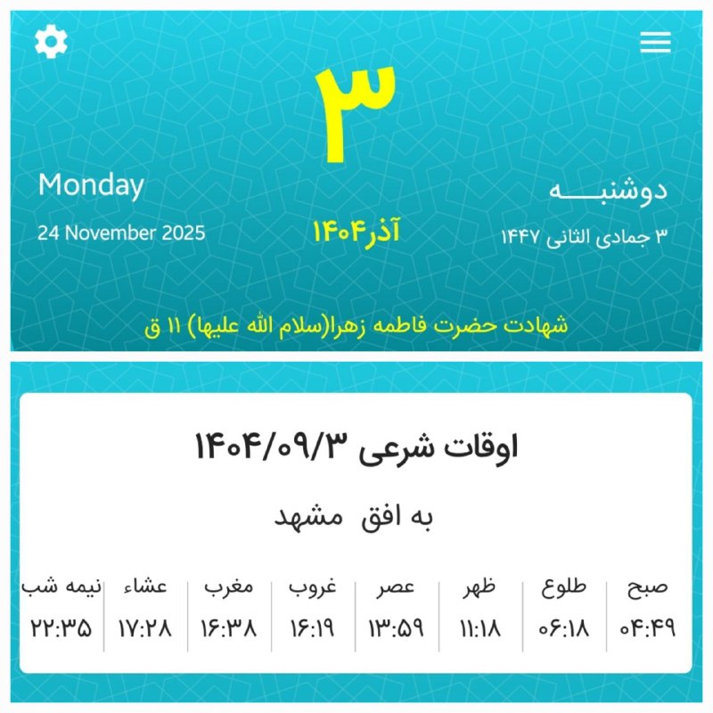 📷اوقات شرعی دوشنبه سوم آذر ماه ۱۴۰۴ به افق مشهد (احتیاط یک تا دو دقیقهای لحاظ شود)