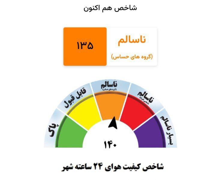 🔹کیفیت هوای مشهد با شاخص ۱۳۵ در وضعیت ناسالم برای گروههای حساس قرار دارد و در ۲۴ ساعت گذشته نیز شاخص کیفی هوا با عدد ۱۴۰ بیانگر استقرار هوای ناسالم برای گروههای حساس بوده است.