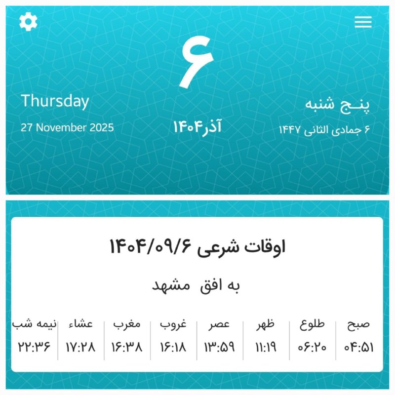 🔸اوقات شرعی پنجشنبه ششم آذر ماه ۱۴۰۴ به افق مشهد (احتیاط یک تا دو دقیقهای لحاظ شود)