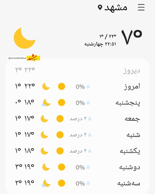 🔸هم اکنون دمای مشهد و پیش بینی هوای مشهد طی ۶ روز آینده