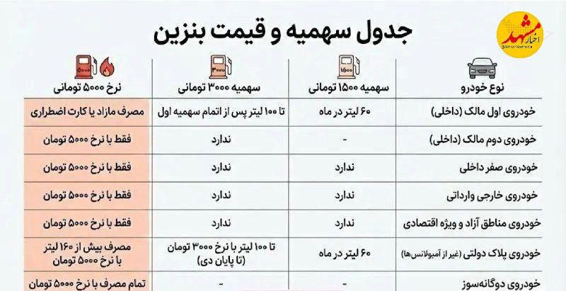 🔹نرخ دوم: هر لیتر ۳۰۰۰ تومان (تا سقف ۱۰۰ لیتر پس از اتمام سهمیه اول)