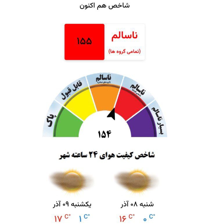 🔹شاخص لحظهای کیفیت هوای مشهد؛ با عدد ۱۵۵ در شرایط ناسالم برای همه گروهها قرار دارد.