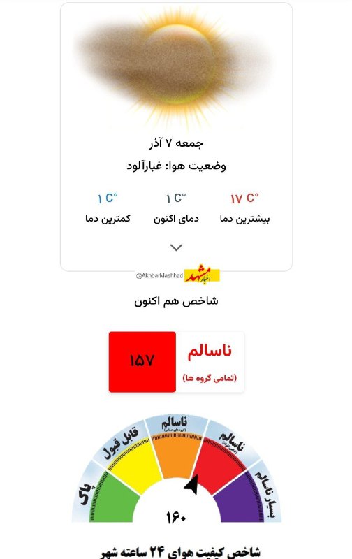 🔹شاخص لحظهای هوای مشهد با عدد۱۵۷ در شرایط ناسالم برای همه افراد قرار گرفته است و در ۲۴ ساعت گذشته نیز کیفیت هوا با عدد ۱۶۰، وضعیت ناسالم برای تمامی افراد داشته است.