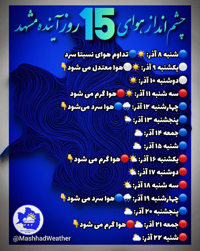 👁️ چشم انداز هوای ۱۵ روز آینده مشهد🍁هواشناسی خصوصی Posted on نوامبر 30, 2025 👁️ چشم انداز هوای ۱۵ روز آینده مشهد 🍁هواشناسی خصوصی مشهد👇 @MashhadWeather