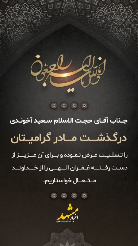 🔸سرور ارجمند جناب آقای حجتالاسلام حاج سعید آخوندی، درگذشت مادر گرامیتان را تسلیت عرض نموده و برای آن عزیز از دست رفته غفران الهی را از خداوند متعال خواستاریم