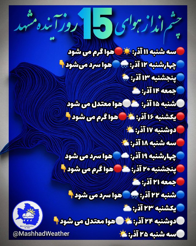 👁️ چشم انداز هوای ۱۵ روز آینده مشهد🍁هواشناسی خصوصی