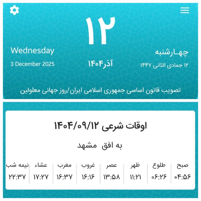 🔸اوقات شرعی ‌چهارشنبه دوازدهم آذر ماه ۱۴۰۴ به افق مشهد (احتیاط یک تا دو دقیقه‌ای لحاظ شود)
