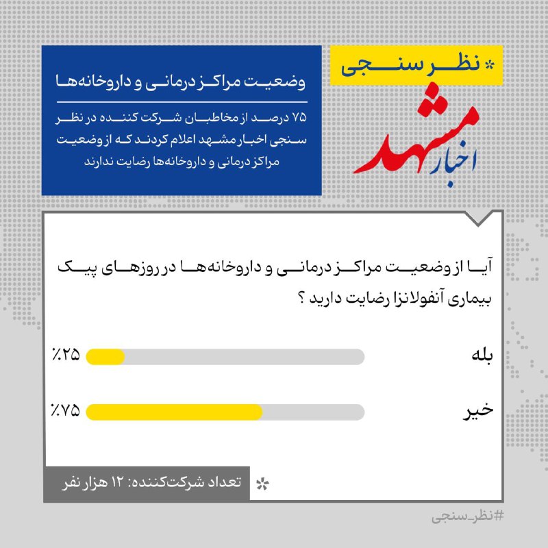 🆔۷۵ درصد از مخاطبان شرکت کننده در نظر سنجی اخبار مشهد اعلام کردند که از وضعیت مراکز درمانی و داروخانهها رضایت ندارند
