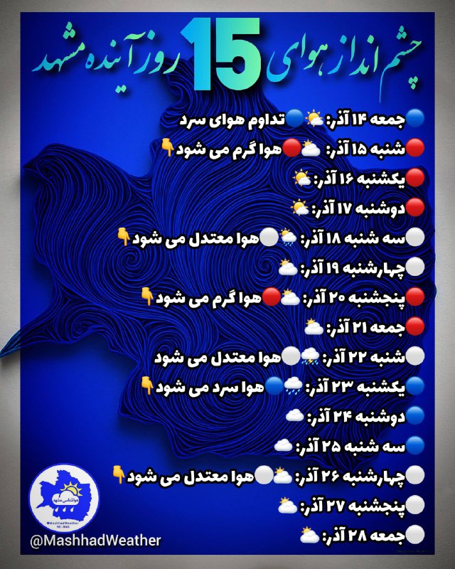 👁️ چشم انداز هوای ۱۵ روز آینده مشهد🍁هواشناسی خصوصی Posted on دسامبر 5, 2025 👁️ چشم انداز هوای ۱۵ روز آینده مشهد 🍁هواشناسی خصوصی مشهد👇 @MashhadWeather