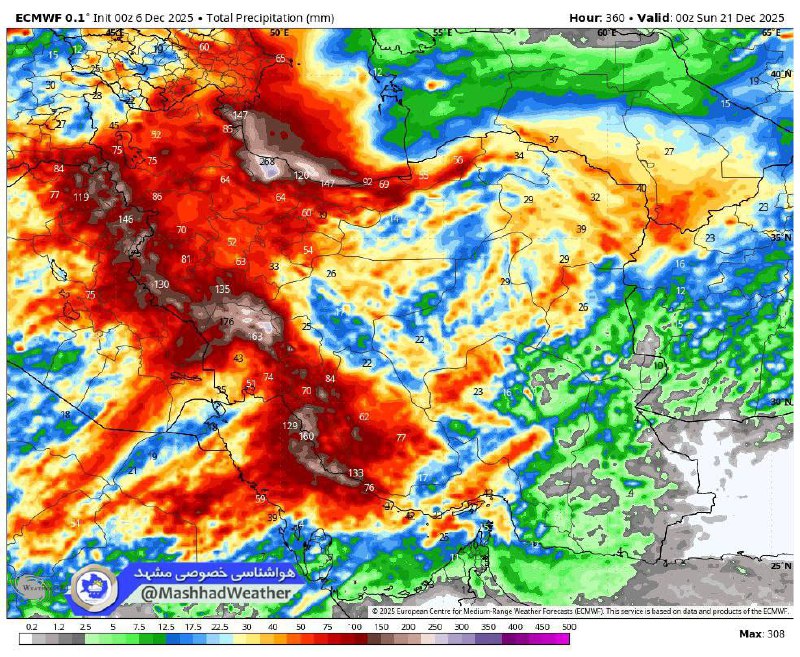 👁️ آپدیت جنجالی مجموع بارش برف و باران کشور طی ۱۵ روز آینده مدل ECMWF