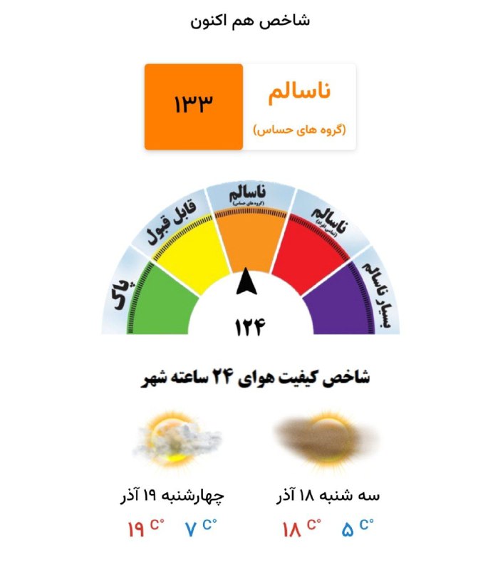 🔹 شاخص لحظهای هوای مشهد با عدد ۱۳۳ در شرایط ناسالم قرار گرفته است و در ۲۴ ساعت گذشته نیز کیفیت هوا با عدد ۱۲۴، وضعیت ناسالم داشته است.