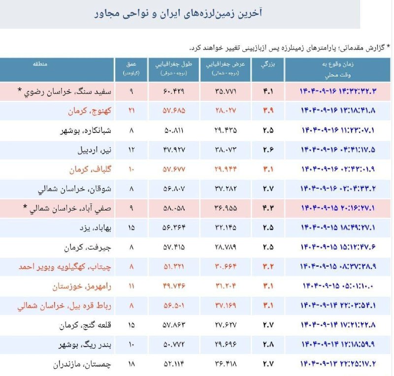 🔴 زلزله ۴.۱ ریشتری سفید سنگ، خراسان رضوی را Posted on دسامبر 8, 2025 🔴 زلزله ۴.۱ ریشتری سفید سنگ، خراسان رضوی را ساعت ۱۴:۳۲ یکشنبه ۱۶ آذر ۱۴۰۴ لرزاند. 🍁هواشناسی خصوصی مشهد👇 @MashhadWeather