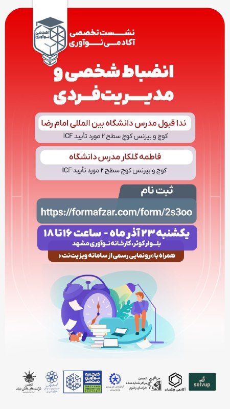 پیشثبتنام نشست تخصصی «انضباط شخصی و مدیریت فردی» تکمیل شد و حالا ثبتنام اصلی آغاز شده است و نیمی از ظرفیت آن تکمیل شده است!