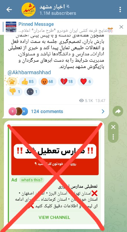 💢اخیراً پلتفرم تلگرام به صورت خودکار و بدون اجازه کانال‌ها، تبلیغاتی را در انتهای پست‌های رسانه‌ها از جمله کانال “اخبار مشهد” نمایش می‌دهد.