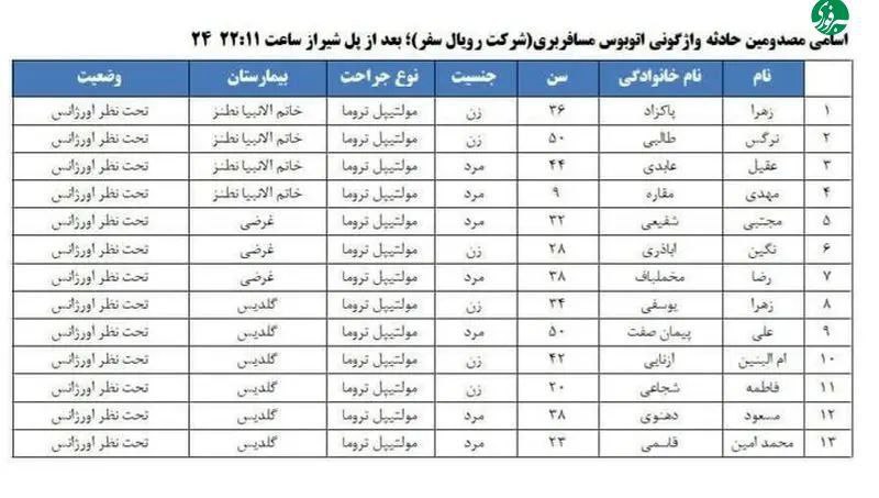 📷اعلام اسامی ۱۳ مصدوم حادثه اتوبوس در آزادراه شرق اصفهان