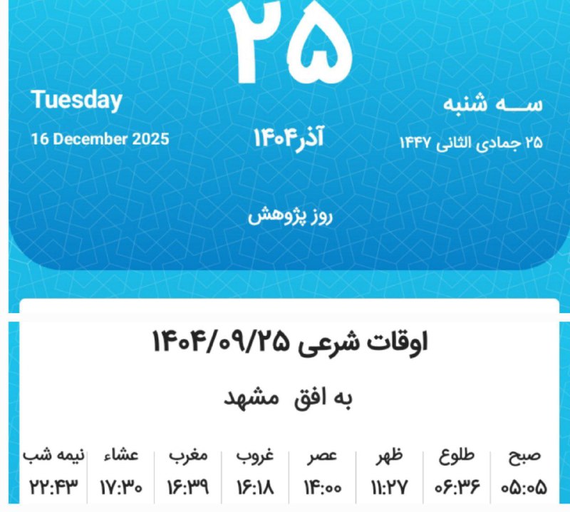 📷اوقات شرعی سهشنبه بیستوپنجم آذر ماه ۱۴۰۴ به افق مشهد (احتیاط یک تا دو دقیقهای لحاظ شود)
