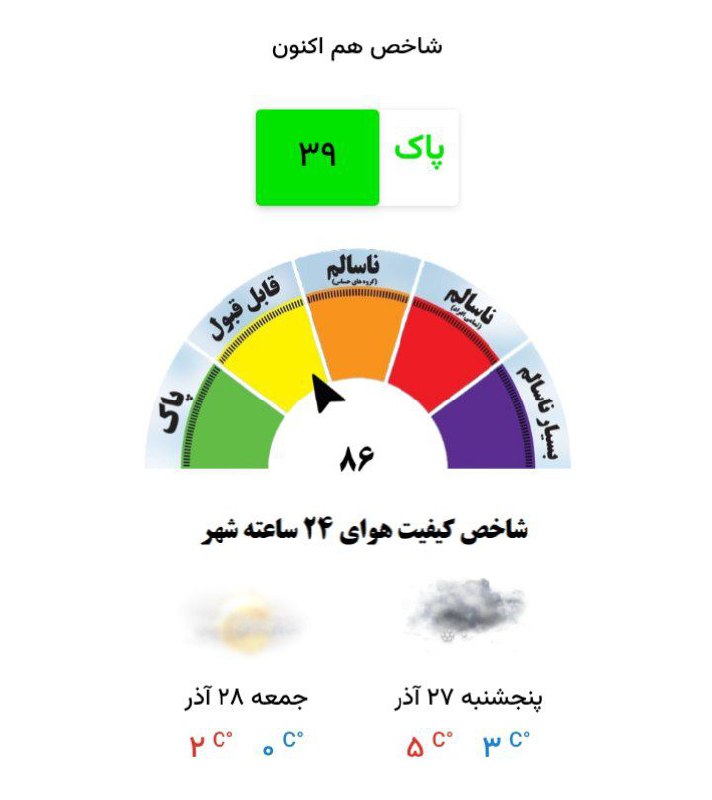 🔹شاخص لحظهای کیفیت هوای مشهد با عدد ۳۹ در محدوده پاک قرار دارد و شاخص ۲۴ ساعته با عدد ۸۶ کیفیت قابل قبول هوا را نشان میدهد