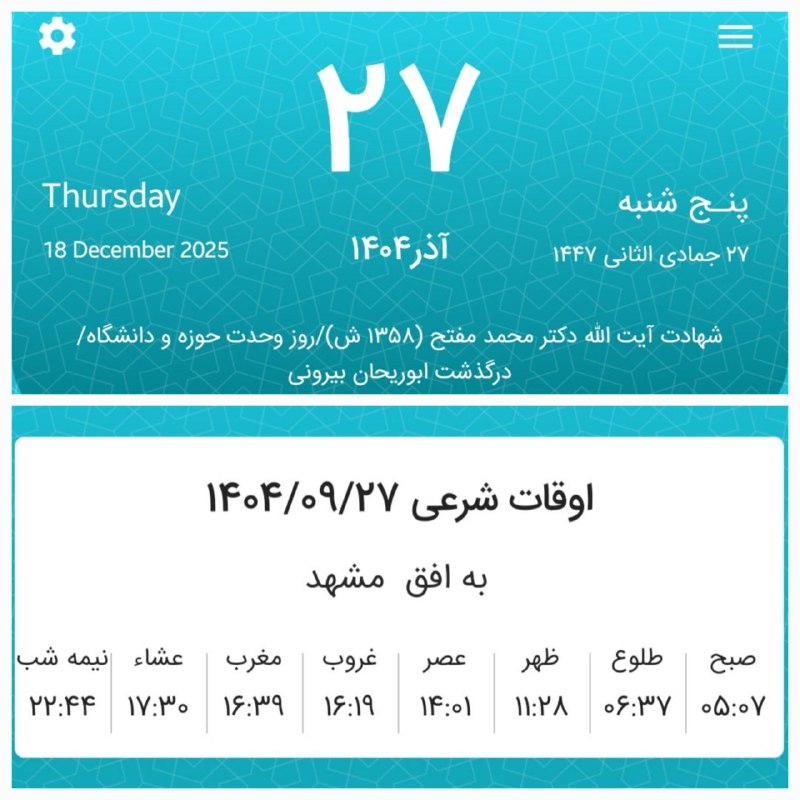 🔸اوقات شرعی پنجشنبه بیستوهفتم آذر ماه ۱۴۰۴ به افق مشهد (احتیاط یک تا دو دقیقهای لحاظ شود)