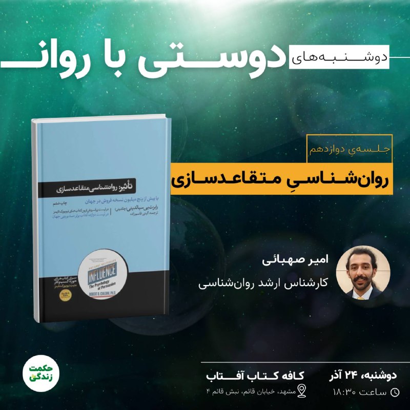 دوازدهمین جلسه از سلسله‌جلساتِ«دوشنبه‌های دوستی با روان»موضوع:تأثیر: روان‌شناسی متقاعدسازیبر