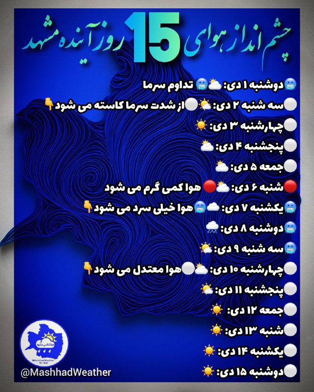 👁چشم انداز هوای ۱۵ روز آینده مشهد❄️هواشناسی خصوصی مشهد👇 Posted on دسامبر 21, 2025 👁چشم انداز هوای ۱۵ روز آینده مشهد ❄️هواشناسی خصوصی مشهد👇 @MashhadWeather