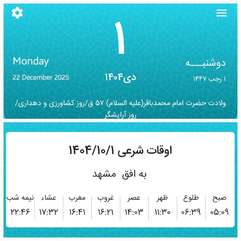 📷اوقات شرعی دوشنبه یکم دی ماه ۱۴۰۴ به افق مشهد (احتیاط یک تا دو دقیقهای لحاظ شود)
